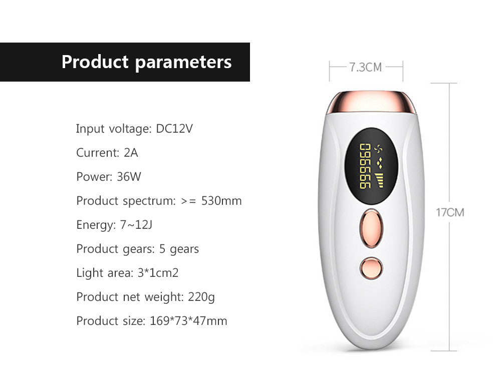 - Incluye: Depiladora, cable de carga, gafas protectoras, manual